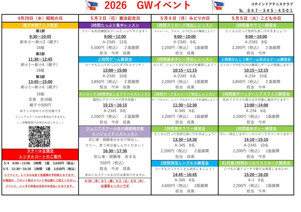 GWイベント案内です。コーチも張り切ってレッスンするので一緒に楽しみましょう!