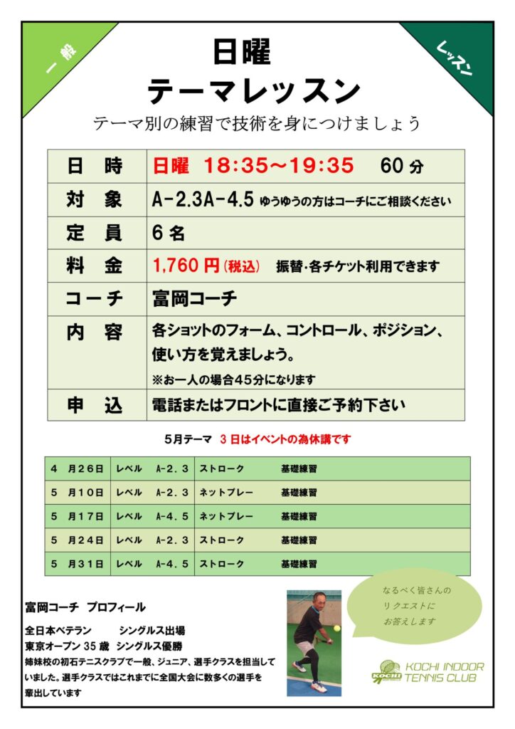 5月テーマレッスン更新しました!! 2026年4月23日 最終更新日時 : 2026年4月23日 manager 日曜テーマ別レッスン5月期更新しました。苦手の克服、さらなる技術向上におすすめです!当日のご予約でも大丈夫ですので是非ご参加ください!※5/3はGWイベント開催のためお休みとなります。
