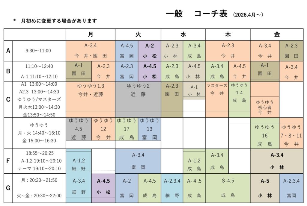 一般 月曜 G A45 今井コーチ⇒小松コーチ 火曜 AB A-2 A-45 園田コーチ⇒小松コーチ